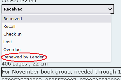 If you're responding to a Renew Pending request from the borrower, you have the option to enter a custom due date at the SAME TIME you submit the Accept Renewal status change. If you don't submit a custom date with the approval, the system will assign a due date that is 42 days from the CURRENT DATE rather than adding to the original due date. (If you accidentally submit Reject Renewal instead of Accept Renewal, there's an undo for that!)